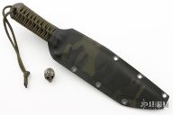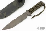 This custom fighter by John Gonzalez himself, features a dark stonewashed blade with false top edge, .201" blade stock and 1.531" blade depth, full tang construction with green paracord wrap. Comes with kydex sheath, original box and custom bead. Excellent condition.
