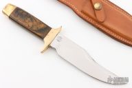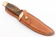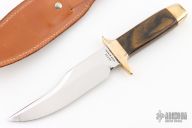 This Bowie from Smith & Wesson features a mirror polished clip point blade with a nearly sharpened top edge, .248" blade stock and 1.350" blade depth, hidden tang construction. The handle is comprised of a brass guard and pommel with wood handle. Includes original leather sheath. Excellent condition. #26535