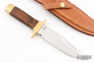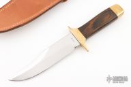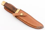 This Bowie from Smith & Wesson features a mirror polished clip point blade with a nearly sharpened top edge, .248" blade stock and 1.350" blade depth, hidden tang construction. The handle is comprised of a brass guard and pommel with wood handle. Includes original leather sheath. Has some scratches, otherwise good condition. #6658