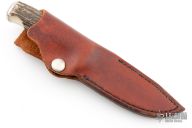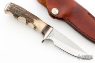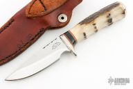 This knife by Gorden Johnson features a mirror polished blade with fileworked spine, .158" blade stock and 1.063" blade depth, hidden tang construction. The handle has a nickel silver guard and butt, stag grip with red/white/black spacers. Excellent condition. 2007 and 30 on the blade. Comes with brown leather sheath.