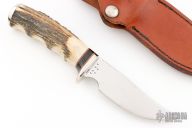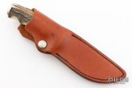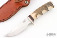 This knife by Gorden Johnson features a mirror polished blade with fileworked spine, .153" blade stock and 1.187" blade depth, hidden tang construction. The handle has a nickel silver guard and butt, stag grip with red/white/black spacers. Excellent condition. 2008 and 02 on the blade. Comes with brown leather sheath.
