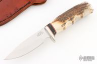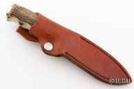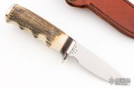 This knife by Gorden Johnson features a mirror polished blade with fileworked spine, .151" blade stock and 1.041" blade depth, hidden tang construction. The handle has a nickel silver guard and butt, stag grip with red/white/black spacers. Excellent condition. 2008 and 09 on the blade. Comes with brown leather sheath.