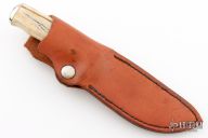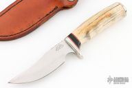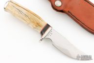This knife by Gorden Johnson features a mirror polished blade with fileworked spine, .151" blade stock and 1.157" blade depth, hidden tang construction. The handle has a nickel silver guard and butt, stag grip with red/white/black spacers. Excellent condition. 2008 and 06 on the blade. Comes with brown leather sheath.