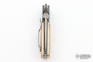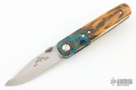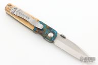 This Po-Boy Mini A-100 by Emerson knives features a stonewashed spear point blade with a notched thumbrest and a custom Meteorite thumbdisc. The handle has Shipwreck copper dovetailed bolsters, mammoth ivory scales, tumbled titanium liners, and a stainless steel tip up clip, lanyard hole in the butt. Comes with original black G-10 scales and a silver shamrock thumbdisc. Comes with original box and papers. #1854 on the blade. Excellent condition, very well done.
