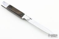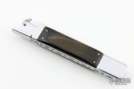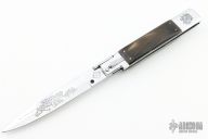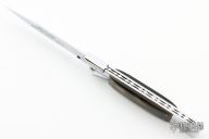 This Picklock Auto by Agasi Hambartsumian of Armenian Doctor Knives features a mirror polished bayonet ground blade with a false top edge. The handle has a polished stainless steel frame with fileworked stainless steel backspacer, buffalo horn scales with brass pins. New from maker.