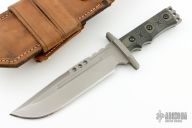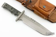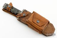 This Bowie by Sick Boy Knife Works features a bead blasted blade with fullers, notched thumbrest and false top edge, .230" blade stock and 1.869" blade depth, full tang construction. The handle has a bead blasted stainless steel guard and black/green G-10 scales. Comes with a brown leather sheath with extra removable leather pouch to hold survival items. Has a couple light scuffs, otherwise excellent condition.
