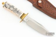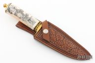 This Bowie by D'Alton Holder features a hand rub satin finished blade with mirror polished flats and a false top edge, .252" blade stock and 1.534" blade depth, hidden tang construction. The handle has a brass guard, fileworked brass collar, and a brass butt, ground stag grip with scrimshaw by "W.C. Shatts". Comes with a hand tooled brown leather sheath, not original, but fits. Excellent condition.