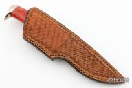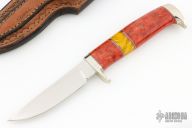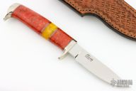 This My Knife by D'Alton Holder features a mirror polished drop point blade with .186" blade thickness and .848" blade depth, hidden tang construction. The handle has nickel silver guard and butt, red apple coral and amber grip with black and nickel silver spacers. Coems with a hand tooled brown leather sheath. Excellent condition.