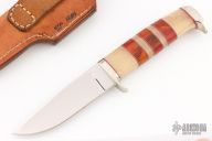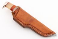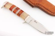 This My Knife by D'Alton Holder features a mirror polished drop point blade with .186" blade thickness and 1.101" blade depth, hidden tang construction. The handle has nickel silver guard and butt, honey horn and amber grip with red and nickel silver spacers. Coems with a hand tooled brown leather sheath. Excellent condition.