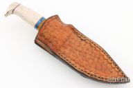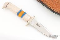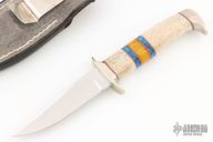 This knife by D'Alton Holder features a mirror polished blade with false top edge, .125" blade stock and .768" blade depth, hidden tang construction. The handle has a nickel silver guard and butt, oosic/turquoise/amber grip with red/nickel silver spacers. Comes with a brown leather sheath. Excellent condition.
