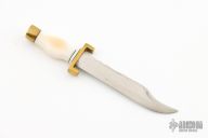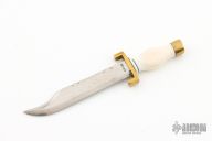 This Miniature Confederate Bowie by Charles Weiss is 3.75" long. It has a hand rub satin finished blade with fileworked spine and false top edge, .095" blade stock and .404" blade depth, hidden tang construction. Has a brass lugged guard and butt, mammoth ivory grip with black/white spacers. Excellent condition.