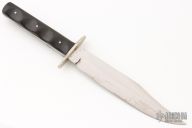 This antique bowie by Rodgers Cutlers to her Majesty features a clip point blade with false top edge, .195" blade stock and 1.106" blade depth, full tapered tang construction. The handle has a nickel silver guard with black wood scales, stainless steel pins. Has some scratches and patina, otherwise good condition for its age. Comes with a wooden display box.