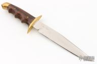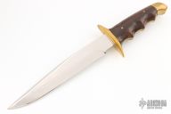 This Knife by D'Alton Holder features a mirror polished clip point blade with false top edge, .199" blade thickness and 1.256" blade depth, hidden tang construction. The handle has brass guard, cocobolo scales over a brass frame with brass rear bolsters. Has some scratches and a few oxidation spots, otherwise good condition.