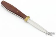 This Dagger by D'Alton Holder features a mirror polished double edged blade with .195" blade stock and .605" blade depth, full tang construction. The handle has a brass guard, maroon linen micarta scales with brass pins. Has a few light scratches and oxidation on the tang, otherwise good condition.