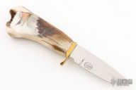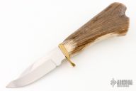 This hunter by Greg Smith features a mirror polished blade with .174" blade stock and 1.196" blade depth, hidden tang construction. The handle has a brass guard with a hand painted stag grip. Painted by "SEMICH". Excellent condition.