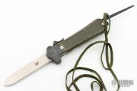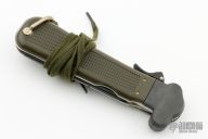 This German Army Paratrooper Knife from Bund features a spear point satin finish gravity blade. The handle is comprised of a steel guard and lever with OD Green plastic scales over metal frame. D Ring lanyard bail and lanyard on pommel. Knife also features a steel C4 punch/Marlin spike that deploys to the rear of the knife. Comes with original box. Excellent condition.