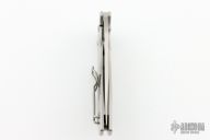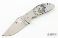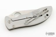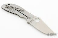 This knife by Spyderco features a satin finished blade with thumbhole and notched thumbrest. The handle has a bead blasted stainless steel frame, tip up Lynch clip, stainless backspacer and lanyard hole. Nice detent and lockup. Excellent condition. Comes with a zippered case and papers.