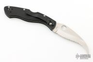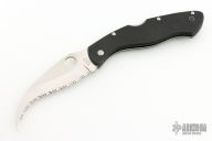 This Civilian Lockback Folder by Spyderco has a satin finished, fully serrated hawkbill blade with thumb hole. Handle is black G-10 with stainless steel (single) liner, stainless steel backspacer/ lock, and tip up/ down 2-way reversible RH black stainless steel clip. Comes with original Spyderco padded zipper case and papers. Excellent condition.