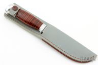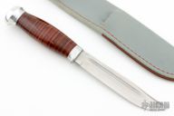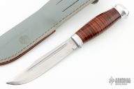 This knife from Helle features a satin finished laminated stainless steel blade with fullers, .119" blade stock and .950" blade depth, hidden tang construction. The handle has a stacked leather grip with aluminum guard and butt. Comes with a leather sheath. Has some light scratches and a little oxidation, otherwise good condition.