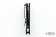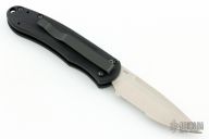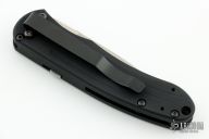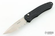 This Alias II Auto by Bradley Cutlery features a spear point tumble finished blade with false top edge, partial serrations and notched thumbrest. The handle has a black aluminum frame with safety, and a tip up or down reversible black stainless steel clip.  Includes the original box. Excellent condition.