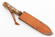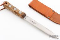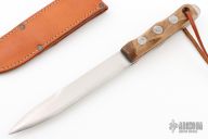 The WWII Model 1 by John Ek in WWII. The handle is red maple with poured lead rivets. Satin finished Nickle-Chrome Moly Steel blade with full tang construction, has a thickness of .119" and depth of 1 ". Tang extends 3/4" at the butt with a lanyard hole in the scales.  Includes a new brown leather half sheath. S/N 1J787. Has some light scratches, otherwise excellent condition for its age.