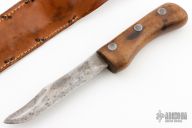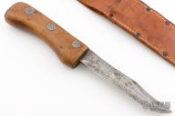 The Vintage Model 5 Navy Short Blade by John Ek has a maple grip with poured lead rivets. Satin finished Nickle-Chrome Moly Steel blade with full tang construction, has a thickness of .126" and depth of 1".  Includes a brown leather sheath from the right period, but it is not original. S/N is no longer visible on the knife. Has some oxidation and scratches, otherwise good condition for its age.