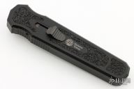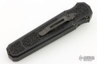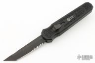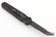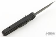 This Harkins Triton OTF Auto has a black tungsten coated 154-CM tanto partially serrated blade. Handle is black anodized aluminum with non-slip inserts. Comes with original sheath. Excellent condition.