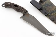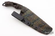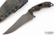 This Necromancer by Kraken Tactical features a dark grey blade with notched thumbrest and false top edge, .169" blade stock and 1.627" blade depth, full tang construction. The handle has brown laser engraved scales with black liners, lanyard hole at the butt. Comes with a kydex sheath with clip and original box. Excellent condition.