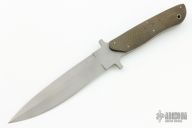 This is a rare pre-Benchmade Pacific Cutlery Fer De Lance. Design by David Steele. Bead blasted blade with sharpened top edge, .167" blade stock and 1.206" blade depth, full tang construction. The handle has green linen micarta scales with lanyard hole. Has a square mark on the top bevel near the plunge line, otherwise excellent condition.