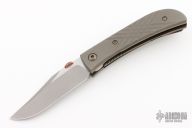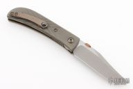 This Jack Pine Savage Jr. by Patrick Doyle features a two-tone stonewash finished blade with a knurled copper thumbdisc. The handle has a milled anodized titanium frame with textured edges, titanium liners and crystalized tip up clip, and anodized titanium screws. Nice detent, lockup and blade seating. Comes with original box and COA. New from maker!