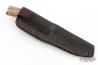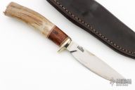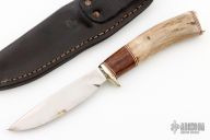 This Hunter by Irvin Campbell features a mirror polished drop point blade with visible temper line, .136" blade stock and 1" blade depth, hidden tang construction. The handle has a nickel silver guard and butt, wood and stag grip with red/white spacers. Comes with a black leather sheath. Has some light scratches, otherwise excellent condition.