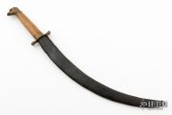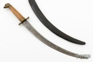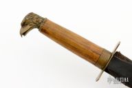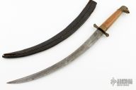 This knife features an upswept blade with a false top edge, .146" blade stock and .909" blade depth, hidden tang construction. The handle has brass fittings and a wood grip. Comes with a black leather sheath. Has some scratches and patina, the sheath is a little rough, otherwise good condition for what it is.