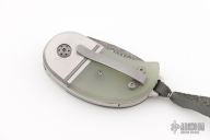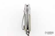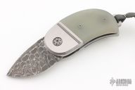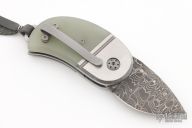 This Minnow features a Chad Nichols Damascus blade with swedge. The handle has 416 stainless fluted dovetailed bolsters, jade g10 scales, 410 stainless steel liners and a matching CPM154 backspacer, tip up stainless steel clip. Nice action, lockup and blade seating.  Includes a padded zippered case. New from maker!