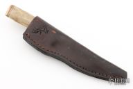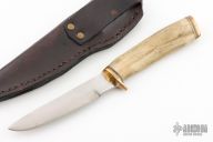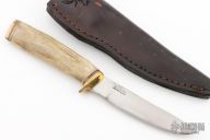 This Hunter by Irvin Campbell features a satin finished drop point blade with visible temper line, .125" blade stock and .784" blade depth, hidden tang construction. The handle has a brass guard and butt, stag grip with black/white/brass spacers. Comes with a black leather sheath. Has some scratches, has been resharpened, otherwise good condition.