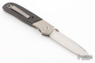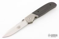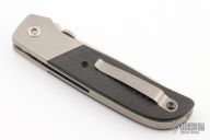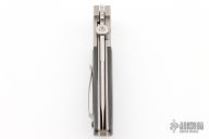 This knife from Bob Terzuola features a tumbled drop point blade with swedge, thumbdisc and notched thumbramp. The handle is comprised of anodized titanium bolsters and liners, carbon fiber scales and an anodized and eggshell finished titanium backspacer, tip up titanium clip. Comes with zipper case. Excellent condition.