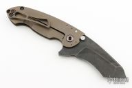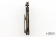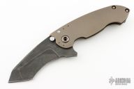This Solo Flipper by Direware Custom Knives features a distressed finish tanto recurved blade with swedge, notched thumbrest, dual blade stops and flipper. The handle is comprised of a textured and anodized titanium frame with a matching titanium clip is positioned for tip up carry. Has a couple light marks and patina. Excellent condition.