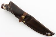 This knife by "Shepherd" (please let us know if you know this makers full name) features a hand rub satin finished blade with .176" blade stock and 1.224" blade depth, hidden tang construction. The handl ehas a brass guard, stag grip with wood/black/brass spacers and a brass butt. Comes with a brown leather sheath. Excellent condiiton.