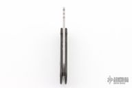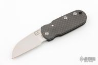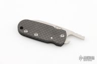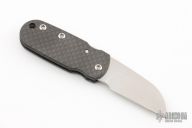 This frikkie from Brian Fellhoelter features a tumble finished wharncliffe blade with bottle opener on friction bar. The handle has a carbon fiber frame with barrel spacers. New from maker!