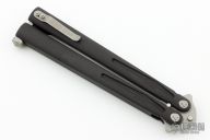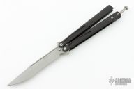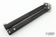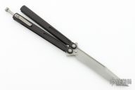 This Tachyon III balisong by Microtech Knives has a bead blasted blade with false top edge. The handles are integral black aluminum with spring latch and tip up stainless steel clip, all blasted hardware. Dated 10/2016 and s/n 00903. Includes the original box and papers.  Excellent Condition.