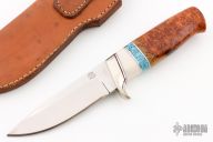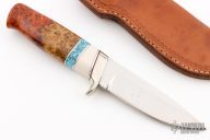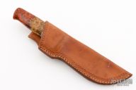 This Hunter by RD Nolen features a mirror polished blade with .192" blade thickness and 1.175" blade depth, hidden tang construction. The handle has a nickel silver guard and butt, Amboyna burl wood grip with black/aluminum/white/turquoise spacers. Comes with a brown leather sheath. Has a couple light stains on the blade, otheriwse excellent condition.