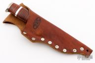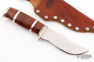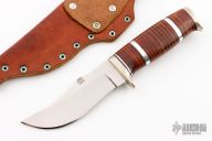 This Hunter by RD Nolen features a mirror polished blade with .185" blade thickness and 1.422" blade depth, hidden tang construction. The handle has a nickel silver guard and butt, stacked leather grip with black/white/aluminum spacers. Comes with a brown leather sheath. Excellent condition.