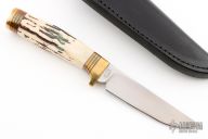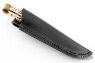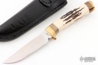 This Hunter by RW Wilson features a satin finished drop point blade, .155" blade stock and .905" blade depth, hidden tang construction. The handle has a brass guard and butt, stag jigged bone grip with red and brass spacers. Comes with a black leather sheath. Excellent condition.  #1413