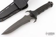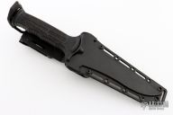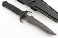 This Mark V by Masters of Defense features a black double-edged recurve blade with notched thumbrest, .225" blade stock and 1.775" blade depth, hidden tang construction. The handle is glass filled nylon with grip tape inserts. Comes with original molded plastic sheath with belt clip. Has some rust and pitting on the blade, otherwise good condition.