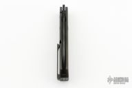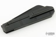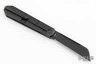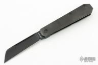 This After Hours Jack is a Barlow (Coffin) slipjoint front flipper model by Jack Wolf Knives featuring a DLC finished sheepsfoot blade with longpull. The handle has integral bead blast finish pinched and fluted titanium bolsters with a stainless spring. Comes with box, metallic tube with Sean Tiffany artwork, leather slip, sticker and microfiber cleaning cloth. New from Maker.