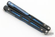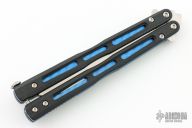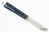 This Model 51 Morpho Balisong from Benchmade has a stonewash finished D2 stainless steel spear point blade. Handle is black G10 with blue jeweled/ anodized titanium liners and blue anodized titanium tip up clip. Comes with original box and papers. Excellent condition.