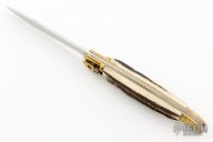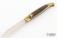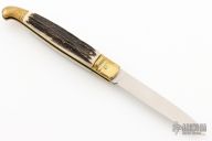 This leverlock auto features a satin finished blade with a stainless spring. The handle has brass bolsters and butt, stag scales and brass liners. Has a couple light scratches, otherwise excellent condition.