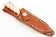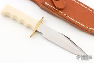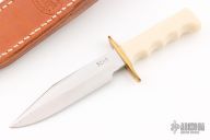 This Mini 14 by Scar Knives is a miniature replica of the Randall Model 14. This knife has a brass hilt and ivorite handle. Has a satin finished blade with sharpened top edge, .124" blade stock and .710" blade depth, full tang construction. Comes with a brown leather sheath made by Gutcher at Sullivans. Excellent condition.