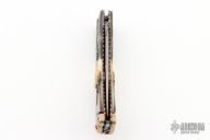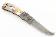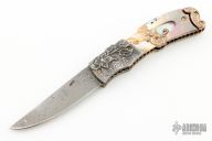 This knife by Suchat Jangtanong features a Chad Nichols Damascus blade with a single gold Dellana Dot and a fileworked thumbrest. The handle has carved Chad Nichols Damascus bolsters, carved black/gold lip pearl scales with a pink pearl inlay, fileworked and anodized titanium liners and a fileworked steel backspacer with diamond insets, gold plated screws, mokume rear bolsters. Comes with zippered case and COA dated May 07, 2015. Nice lockup and blade seating. Very impressive work. Excellent condition.