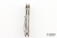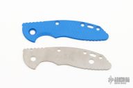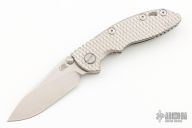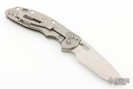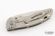 This XM-18 from Rick Hinderer features a stonewashed blade with notched thumbrest and dual thumbstuds. The handle has a textured titanium scale, stonewashed titanium frame, titanium barrel spacers, titanium hardware, titanium Deep Carry pocket clip. Dual thumb studs and notched thumbrest. Reversible pocket clip. Strong lock up, nice detent and blade seating is center. Comes in the original box, blue G-10 scale and liner and extra hardware. Excellent condition.