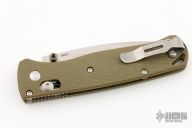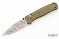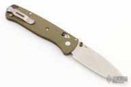 The Benchmade Custom Bugout features a drop point blade with a stonewash finish and laser engraving. It's a manual opener with ambidextrous thumb studs. This AXIS lock has green G-10 handles with satin hardware, a mini deep-carry pocket clip, and a lanyard hole. Includes original box and papers. Excellent Condition.